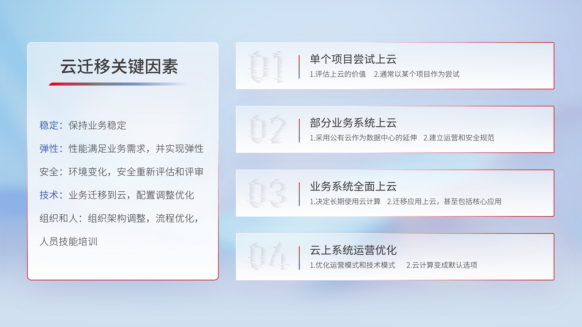 结合实际业务,,,从规划设计、、云平台选型、、、云原生改造、、、数据迁移、、、、集成交付,,,,迁移全过程为客户识别最佳上云路径,,,,做好风险识别管理,,,,设计网络架构、、、身份权限、、、、安全审计合规、、操作审计、、日志审计、、、、监控告警策略、、、、多站点容灾设计等,,,对云上基础设施进行整体规划,,提升IT治理水平,,,,以满足弹性、、、、高可用、、高性能的需求。。